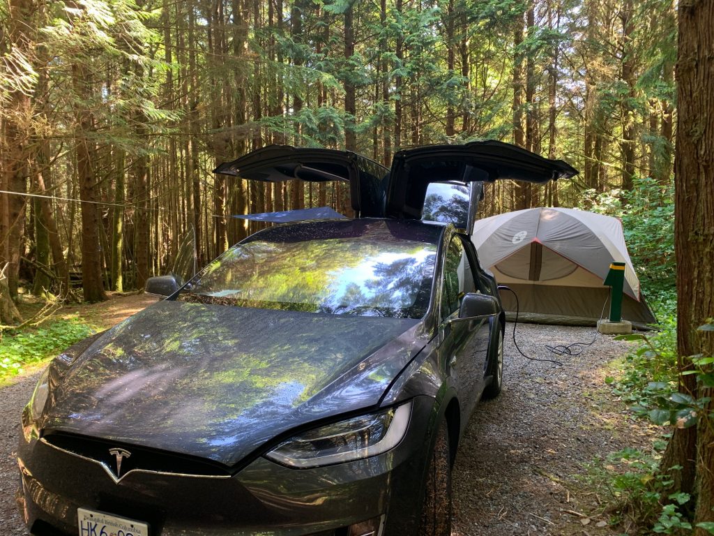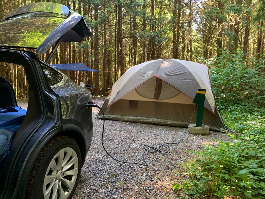 They plugged the vehicle in at the campsite’s 120v outlet and let it charge overnight. It charged approximately 50 km: more than enough to drive to the rainforest loop trailhead for a day hike and then the Kwisitis Visitor center before returning back to camp for dinner and another overnight charge.